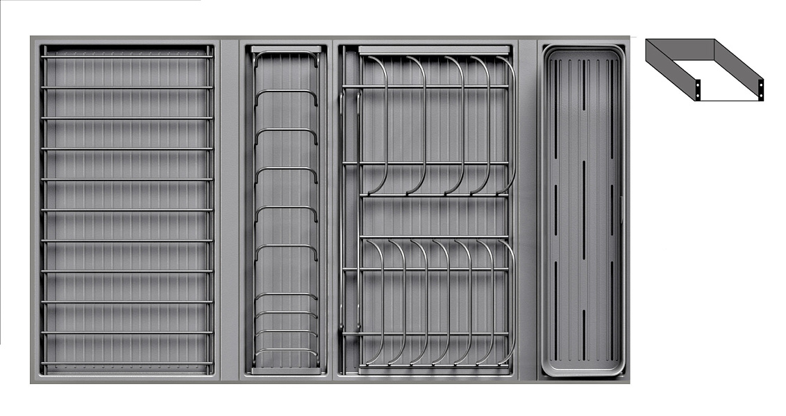 1 для столовых приборов (состоит из: 1 х емкость пластиковая 400 х 100 х 120 мм, 1 х поддон пластиковый 423 х 124 мм)