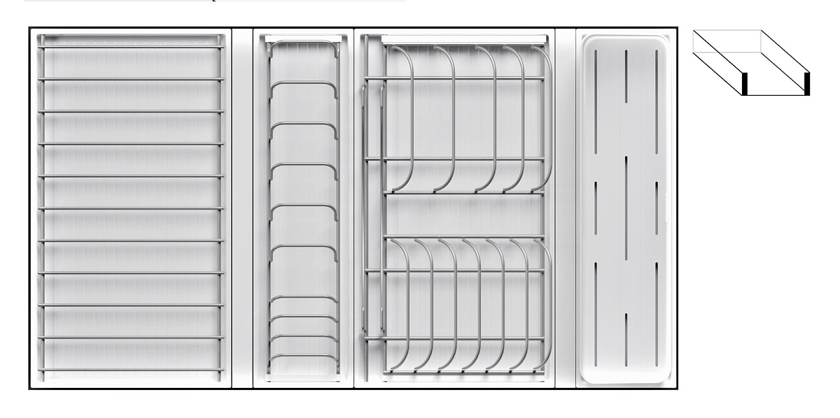 1 для столовых приборов (состоит из: 1 х емкость пластиковая 400 х 100 х 120 мм, 1 х поддон пластиковый 423 х 124 мм)