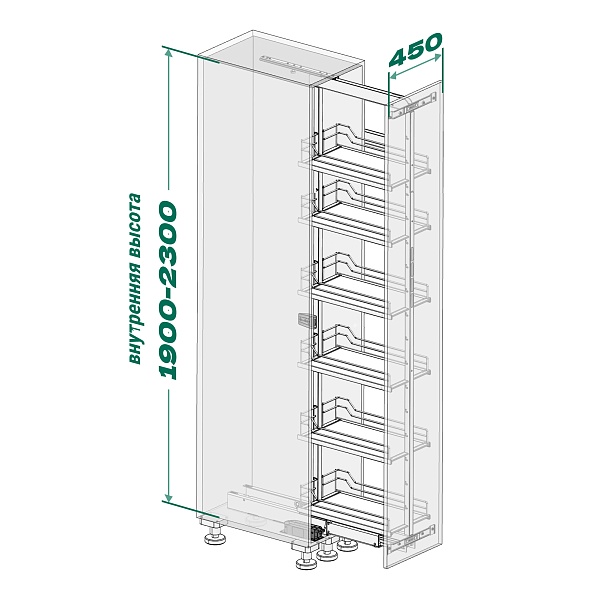 • Высокая нагрузка на механизм в 100 кг (по 18 кг на полку) позволяет организовать хранение большому количеству предметов, при этом даже при полной загрузке система выдвигается легко.